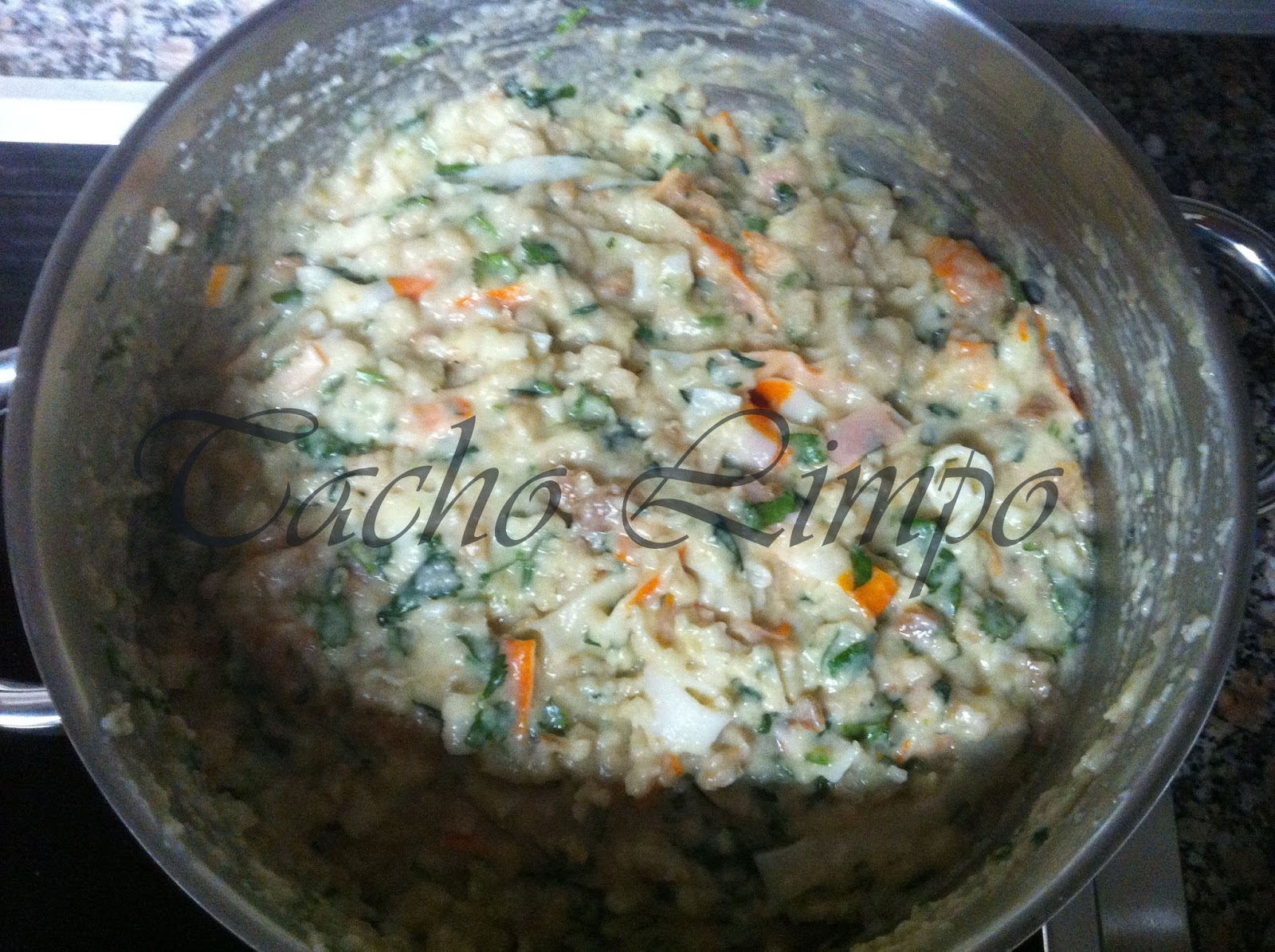 Num tacho, deite os alhos, o azeite, 15 g de coentros e leve ao lume a alourar. Junte o pão e mexa muito bem para que tudo fique bem misturado. Adicione aos poucos a água sem deixar de mexer para que o pão fique em papa. Junte as delicias e envolva tudo muito bem. Retire do lume, adicione o ovo, os restantes coentros e envolva tudo muito bem. Leve novamente ao lume e deixe cozinhar durante 7 minutos sem parar de envolver. Retire do lume e sirva de imediato.