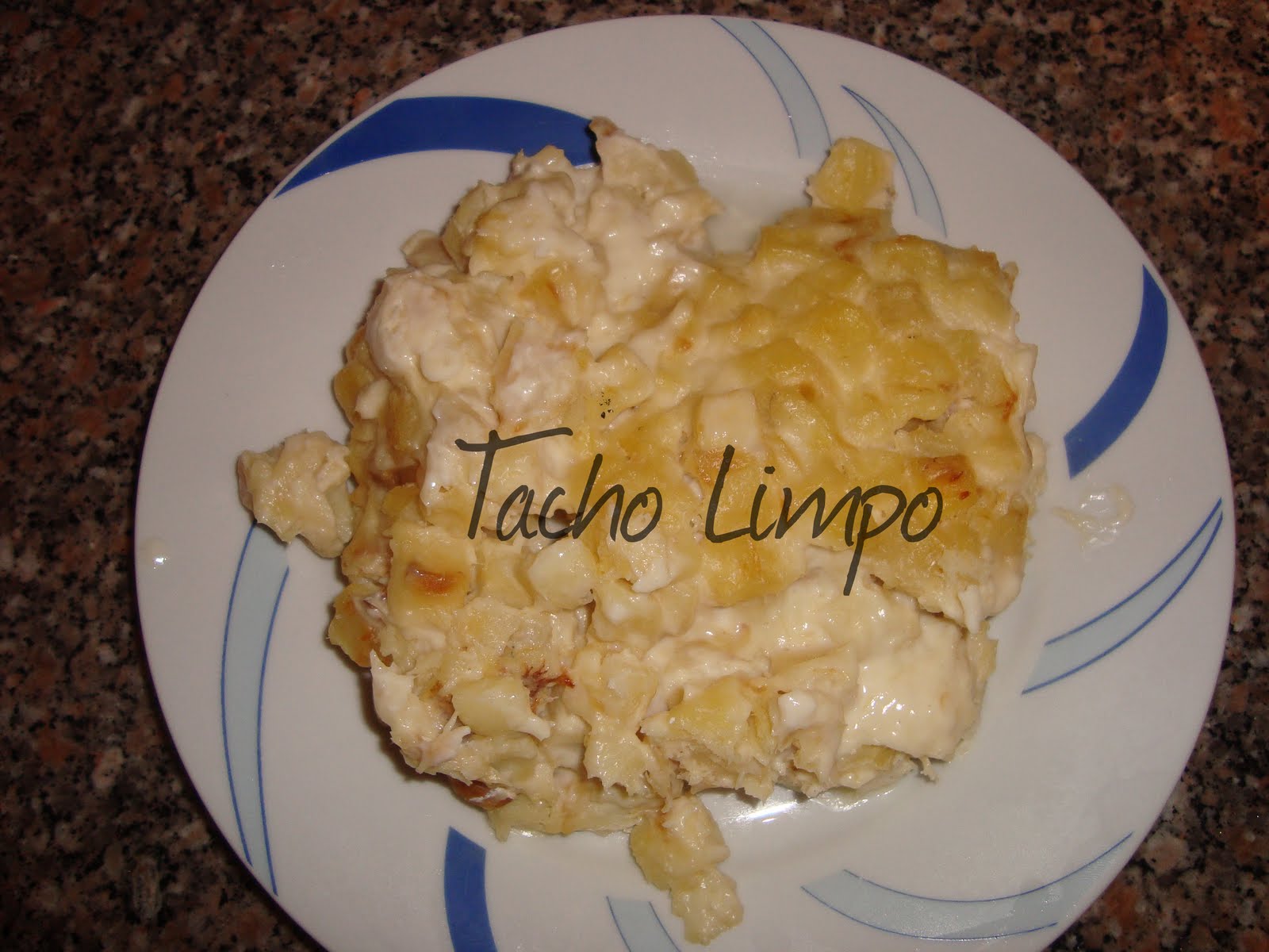 A minha familia gosta muito de bacalhau com natas, mas o que eu faço é muito complicado. Então resolvi usar a bimby e a receita que vem no livro, fazendo apenas uma pequena alteração: substitui a batata palha por batata aos cubinhos pequenos.