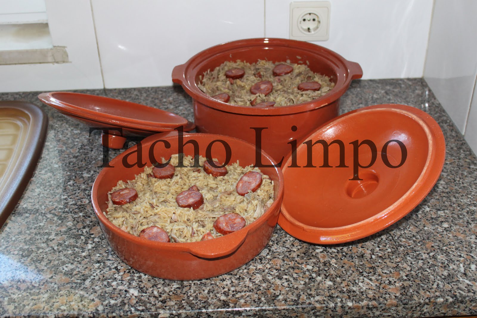 Coloque o arroz num tabuleiro ou num tacho de barro, misture as carnes, excepto as rodelas do chouriço que são para enfeitar.